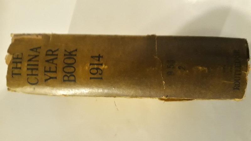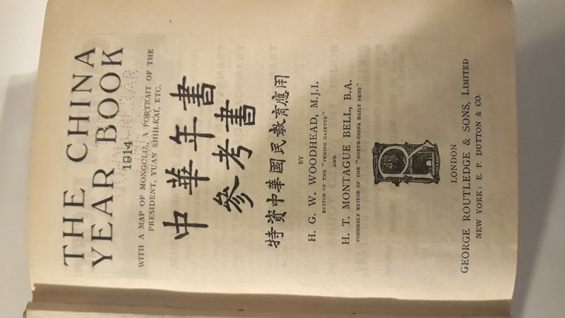 London [1914], Routledge. Yellow cloth, very good, 781p., in index, appendices, bibliography, statistical charts, foldout map. SCARCE With general descriptions, geology, fauna, flora, climate & meterology, people & language, products, money, weights and measures, manufactures, commerce, trade statistics, communications, posts and telegrahs, government, defence, finance, shipping, land, education, public justice. Constitutional developoment, religions, public health, China in 1914, foreigners in China, conservancies, opium, miscellaneous &c. With a map of Mongolia. * Edited by H.T. Montague Bell, & H.G. W. WOODHEAD. Scans can * NOTE: We have more than one copy of this title. Use caution when ordering: Last copy is: PASON J. TREAT'S SIGNED COPY Immaculate condition, evidence of an old spine mark from the Library, an uncirculated reference copy, PAYSON J. TREAT COLLECTION. * FIRST AND ONLY EDITION *.